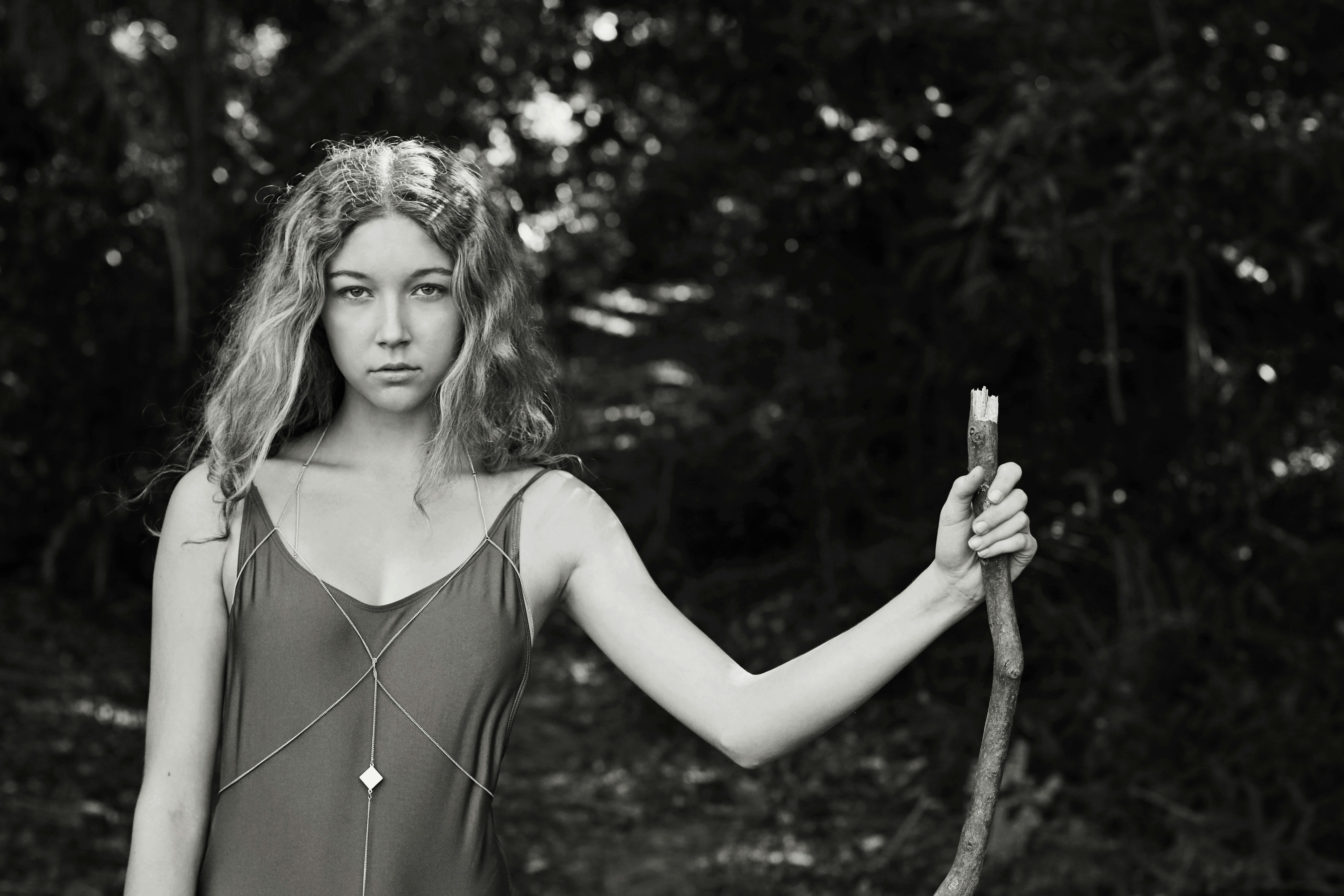 一個黑白相間的照片,一個年輕女子手持一根棍子在森林附近