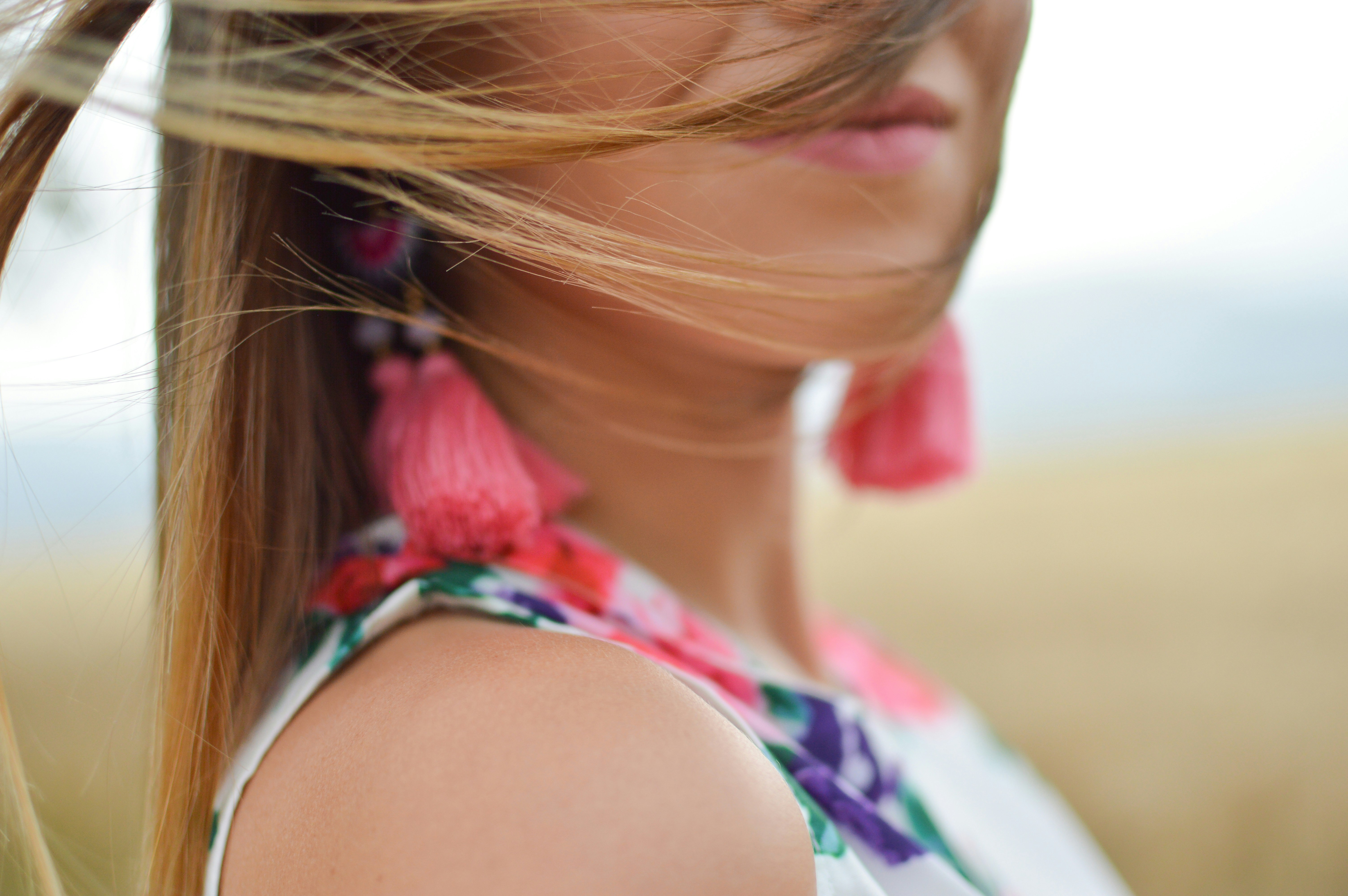 一個女人臉上的頭發(fā)和粉紅色條紋耳環(huán)的特寫鏡頭