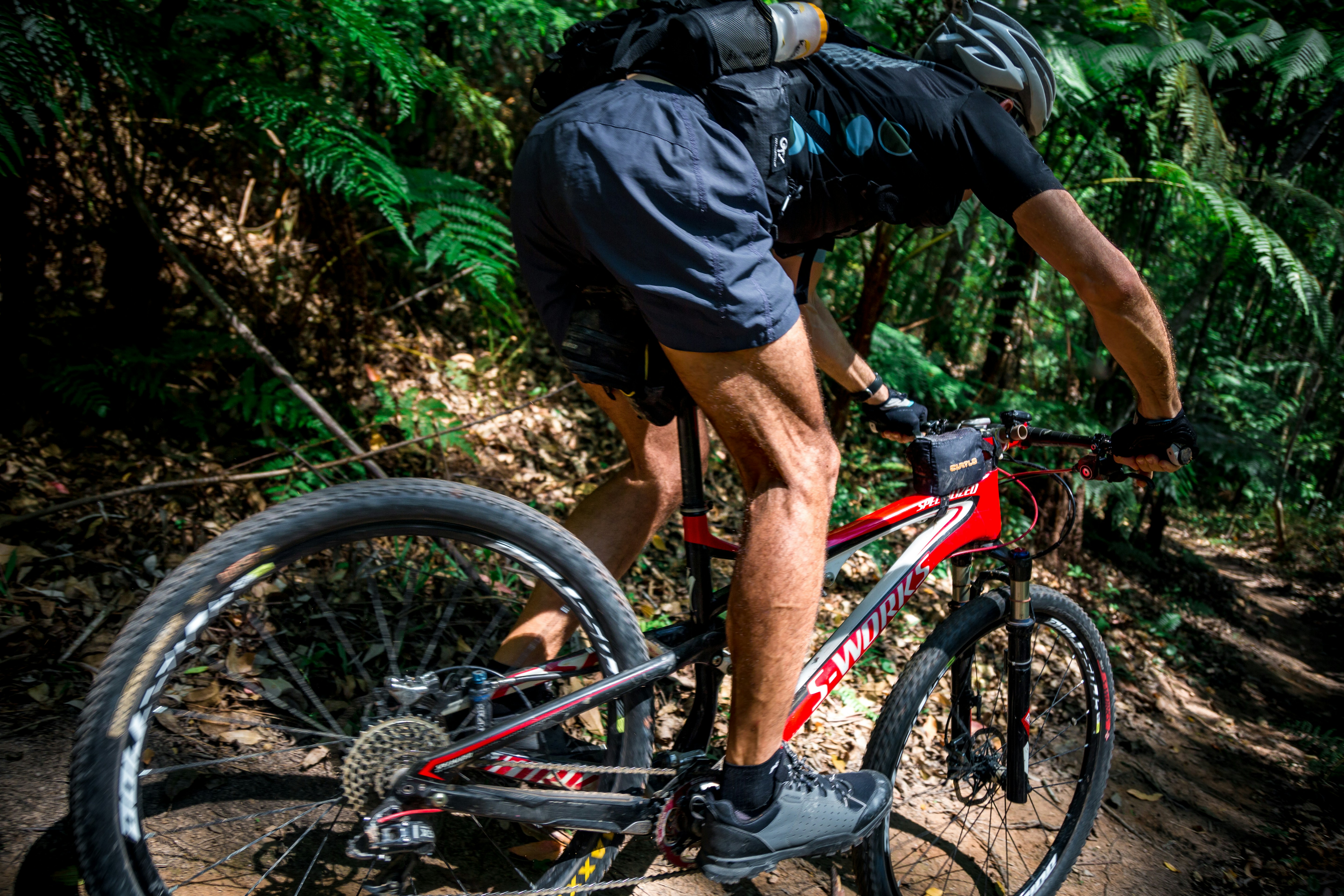 自行車,自行車,男人,騎自行車,騎自行車,騎自行車,山地車,樹,林地,森林,小路,軌道,外面,自然,下坡,水渠