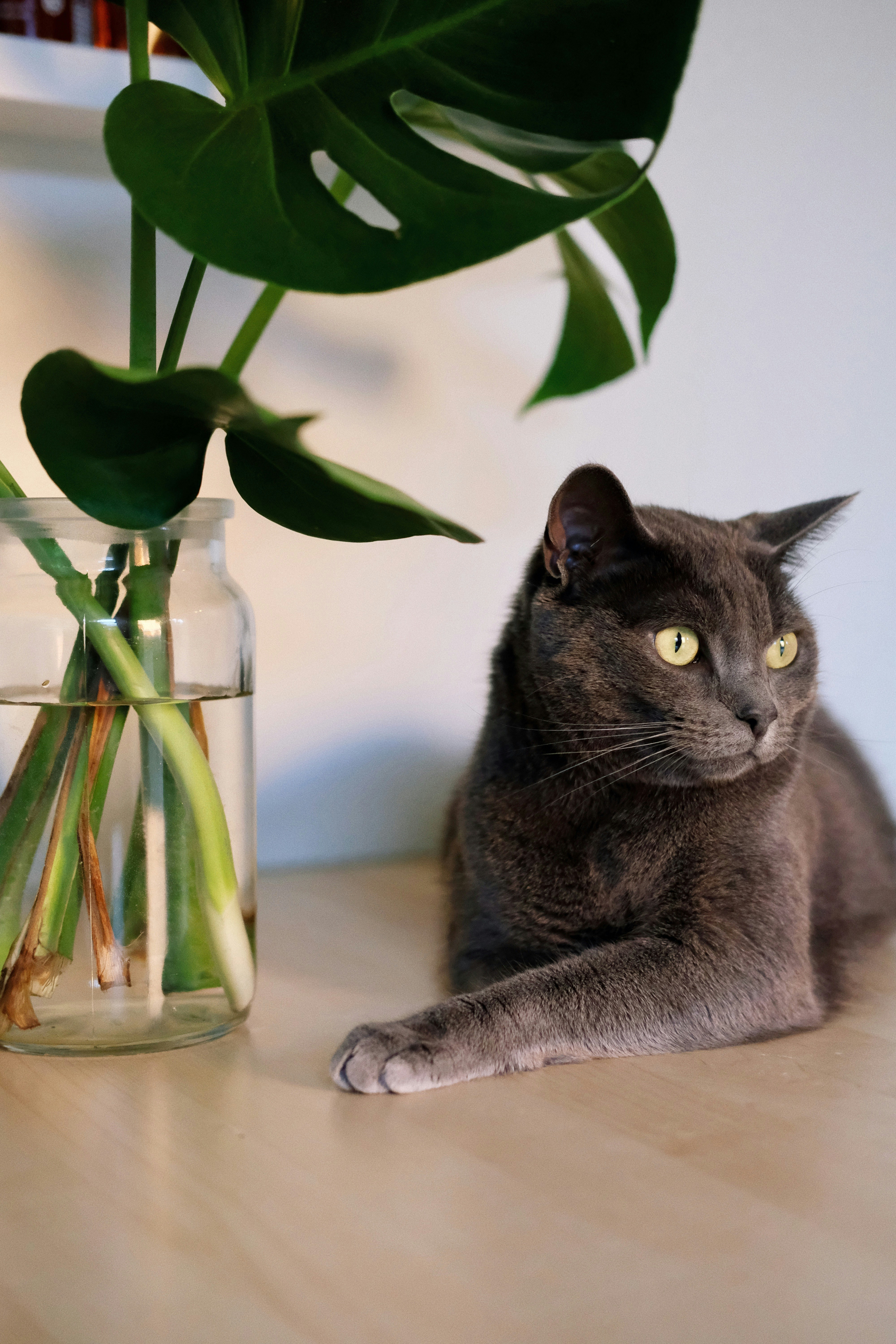植物,樹葉,玻璃,罐子,水,貓,黑色,灰色,貓科動物,極小的,有機的,自然的,動物的,葉子的