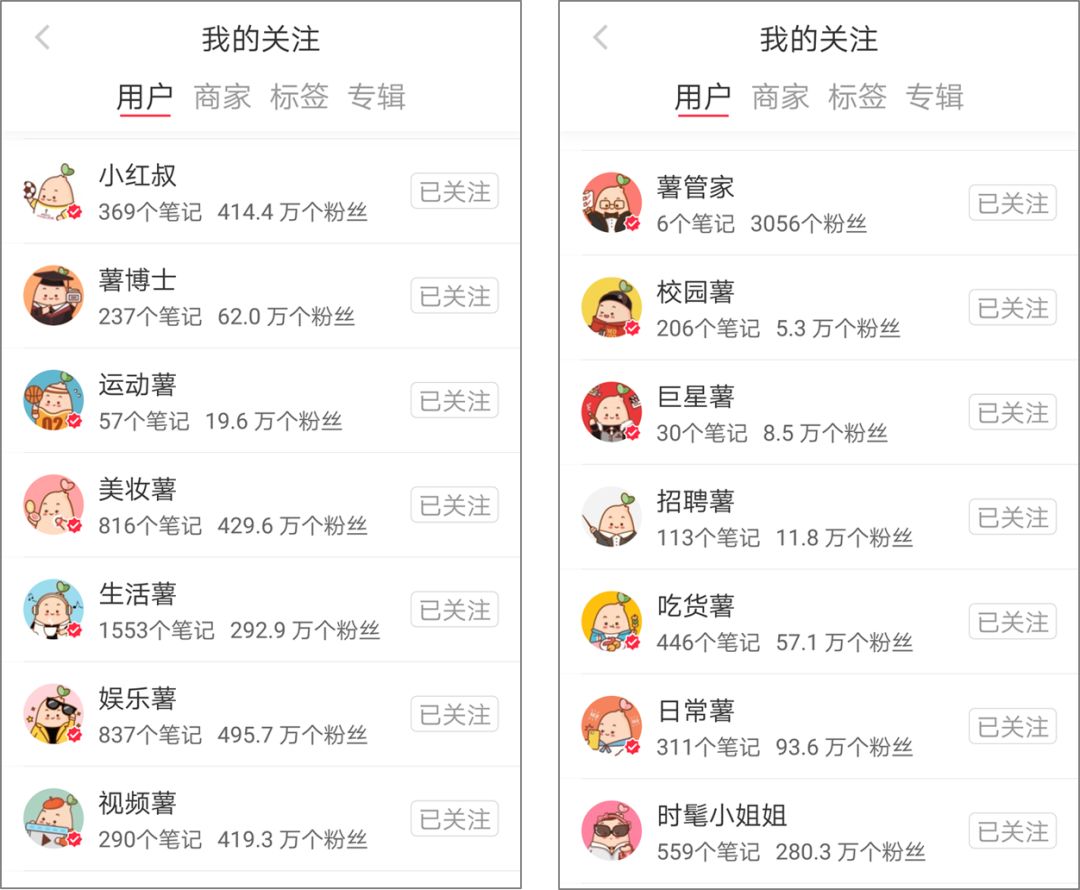 例如:薯隊(duì)長、穿搭薯、視頻薯、娛樂薯、生活薯、運(yùn)動(dòng)薯、日常薯、吃貨薯、照片薯、巨星薯、校園薯等。