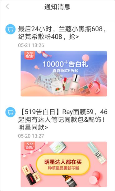 小紅書基本每一條 Push 都會(huì)帶上特殊符號(hào),吸引用戶點(diǎn)擊,例如「點(diǎn)擊查看詳情>>>」。而在平臺(tái)系統(tǒng)通知里,也會(huì)有「戳>」、「搶>」這種「文字+特殊符號(hào)」,指引用戶前往商城。