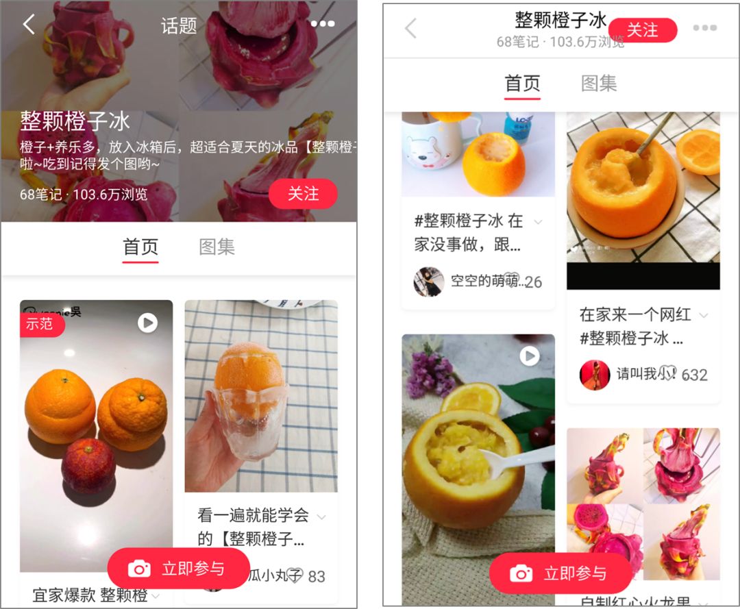 例如,小紅書前段時(shí)間抓住宜家推出的網(wǎng)紅食品推出了專題「整顆橙子冰」,讓用戶上傳自己的制作和食用筆記。