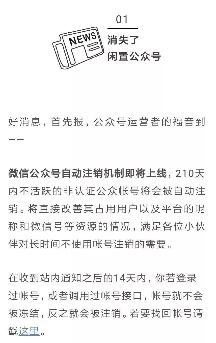 微信發(fā)文通告:210天內(nèi)不活躍的非認(rèn)證公眾號(hào)將自動(dòng)注銷,收到消息內(nèi)14天重新登錄可免于被注銷。