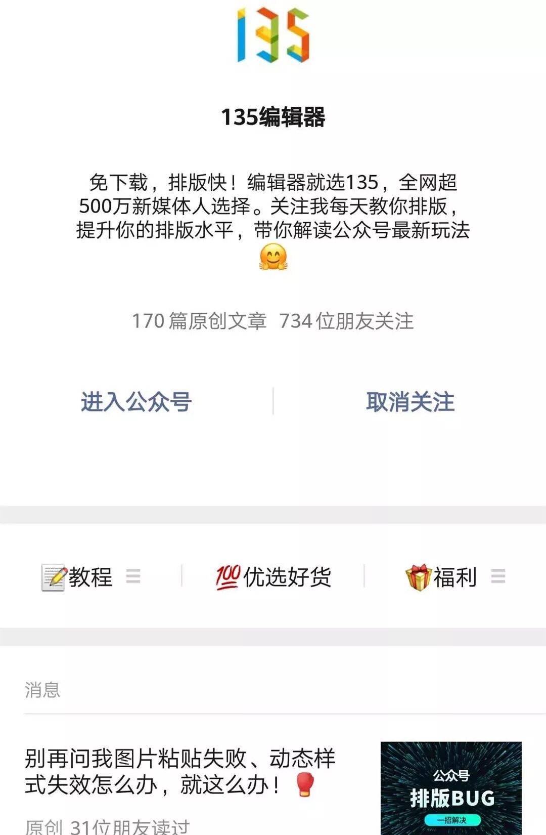 公眾號(hào)顯示資料全面改版。新增原創(chuàng)文章數(shù)、好友關(guān)注、三篇?dú)v史圖文、以及菜單欄、取消關(guān)注等。