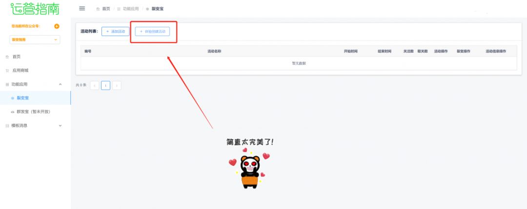 為了可以讓運營者提前體驗漲粉裂變活動設(shè)置,運營指南裂變寶開創(chuàng)了“體驗活動”模塊,無需購買即可自主設(shè)置。只有自己體驗了,才知道合不合適。