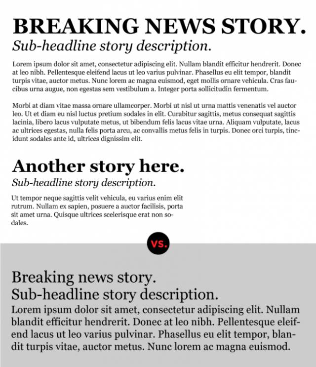 在排版中,層次這個(gè)詞是區(qū)分文本和不同元素的重要性區(qū)別的學(xué)術(shù)性說(shuō)法。以我們所熟知的報(bào)紙為例,標(biāo)題闡述核心,尺寸最大,文字大寫(xiě),粗體強(qiáng)調(diào),其次是副標(biāo)題,字體小點(diǎn),文字不再大寫(xiě),再其次是正文,字體最小。