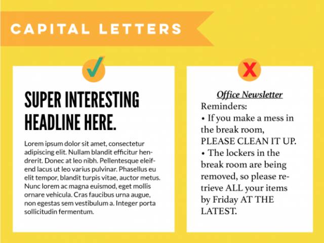 文字部分常見(jiàn)的手法很多,斜體、粗體、下劃線、大寫(xiě)、增大字體大小,等等。但是千萬(wàn)不要將所有的強(qiáng)調(diào)方式都用在同一篇文字同一個(gè)段落中,這樣會(huì)讓它看起來(lái)凌亂不堪。