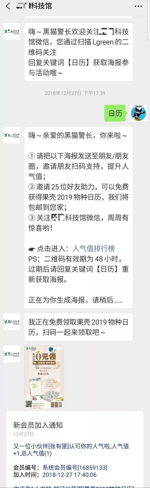 海報(bào)投放出去,如果投放渠道優(yōu)質(zhì),海報(bào)就會(huì)不斷地被分享,不斷地吸引新粉絲關(guān)注公眾號(hào)。新粉絲進(jìn)入公眾號(hào)之后,會(huì)自動(dòng)收到消息提示,告知Ta活動(dòng)詳情。如果Ta對(duì)獎(jiǎng)品感興趣,也會(huì)參與活動(dòng)、生成自己的專屬海報(bào),如果Ta對(duì)獎(jiǎng)品不感興趣,那么這個(gè)用戶可能就不是你想要的精準(zhǔn)粉絲。