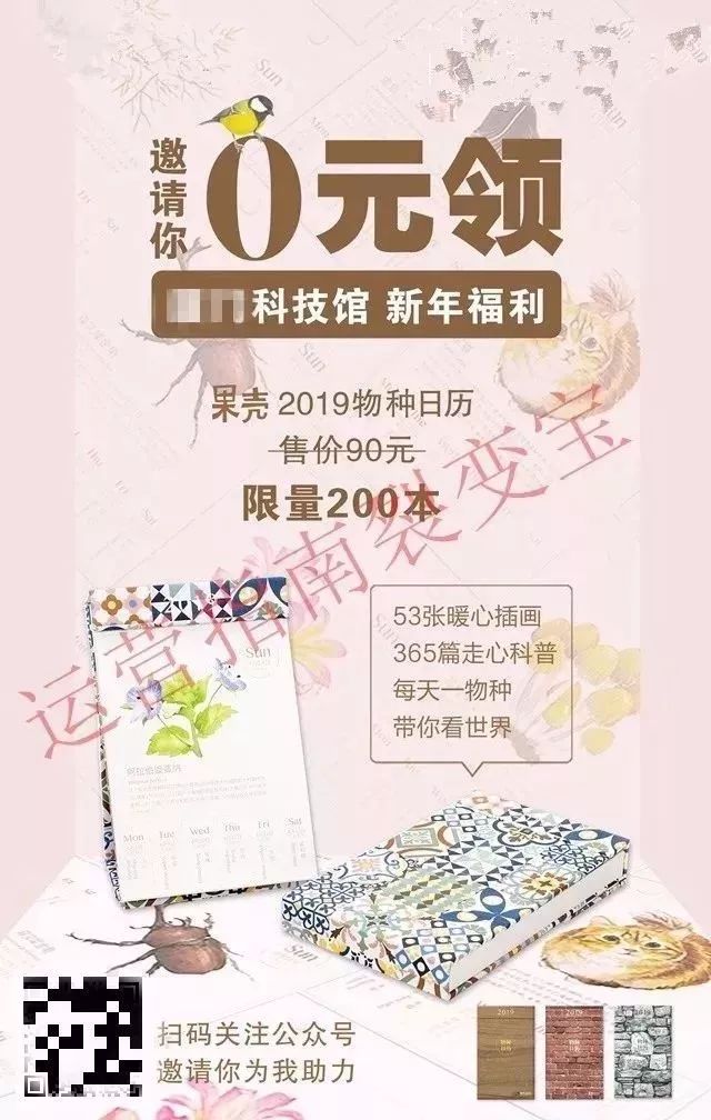 還有一點(diǎn)也很重要——“限量200本”,提示“限量”可以營(yíng)造緊迫感,告訴用戶趕快掃碼不要猶豫。其實(shí)這個(gè)科技館最后還追加了一批日歷,因?yàn)榱炎冃Ч茫?00本不久就被搶光了,他們決定趁熱打鐵,追加庫存繼續(xù)收割粉絲。