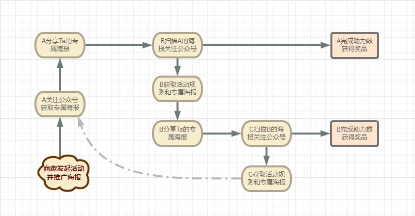 用戶轉(zhuǎn)發(fā)裂變海報(bào)到朋友圈,通過掃描他海報(bào)上二維碼關(guān)注公眾號(hào)的朋友,都算是為他助力,助力的人數(shù)達(dá)到設(shè)定的值,就能領(lǐng)取獎(jiǎng)品。