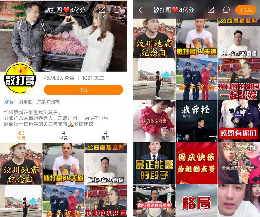 就像散打哥,他的視頻大多反映社會(huì)現(xiàn)實(shí),充滿(mǎn)正能量。在粉絲心中,散打哥就是他們生活中充滿(mǎn)正能量的大哥,粉絲也親切地稱(chēng)他為“打哥”。