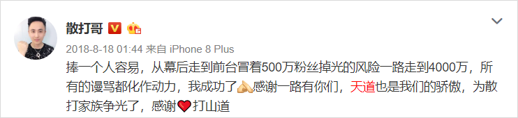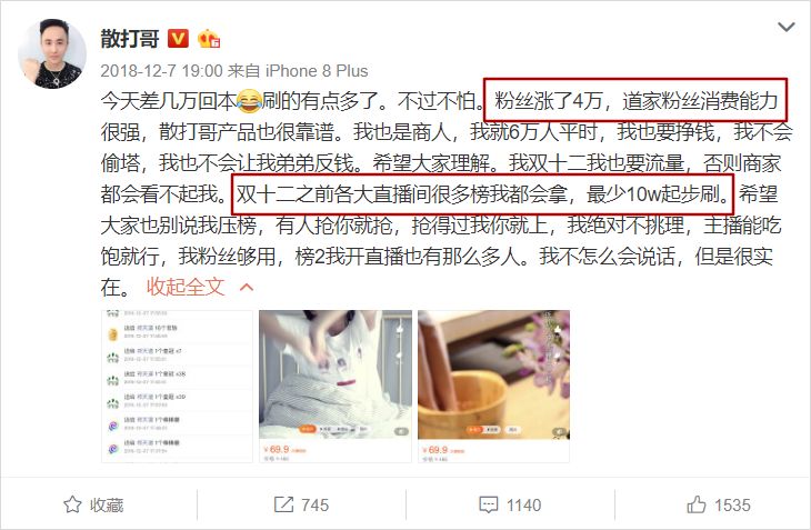 他曾經(jīng)在祁天道的一場(chǎng)直播中刷了 30 多萬(wàn)奪得榜首,隨機(jī)開(kāi)啟了豪刷秒榜的賣(mài)貨形式,并還發(fā)文稱(chēng)今天刷的有點(diǎn)多,不過(guò)不怕。漲了 4 萬(wàn)多粉絲,還夸祁天道粉絲的消費(fèi)能力強(qiáng)。這場(chǎng)直播下來(lái),散打哥賺得盆滿(mǎn)缽滿(mǎn)。