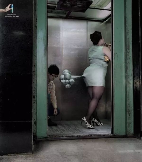 電梯這種狹窄密閉的公共空間,顯然是人們最容易受到異味侵?jǐn)_的地方。而這個空氣清新劑的廣告,就是展現(xiàn)了這樣一個極端場景: