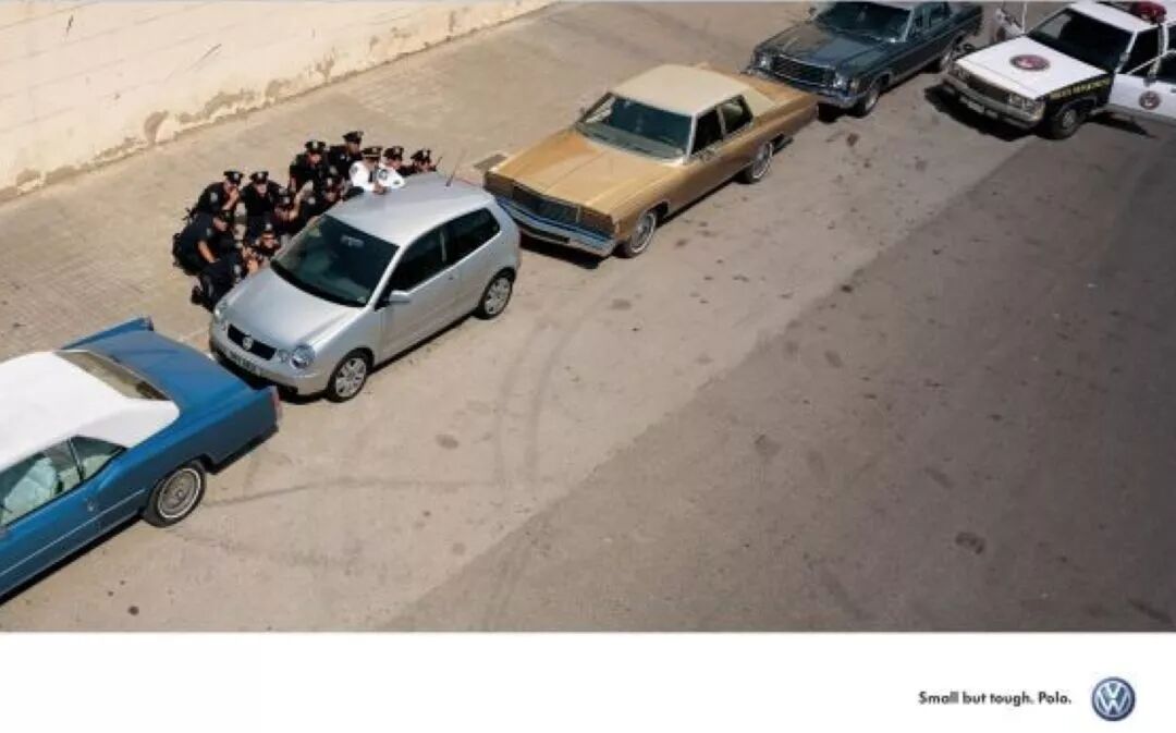 2004年戛納廣告節(jié)平面類全場大獎作品——大眾POLO“雖然小,卻夠硬”。