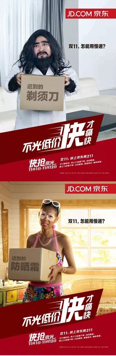 類似的還有京東雙11“戲謔”天貓的廣告:雙11,怎能用慢遞?這就是反其道而行之。