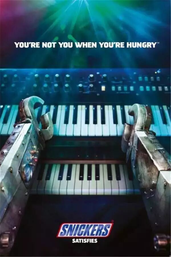 士力架廣告:當(dāng)你感到饑餓,是不是手指顫抖,額冒冷汗,虛弱沒有力氣?士力架的這個廣告依舊圍繞這一點展開,彈鋼琴的手變得像機器人一樣重。饑餓讓你變得身不由己。