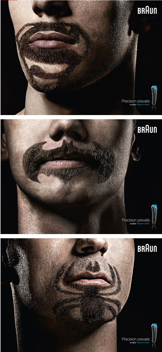博朗剃須刀廣告:通過蝙蝠俠、蜘蛛俠、超人這種夸張造型,突出這款剃須刀的靈巧、鋒利。