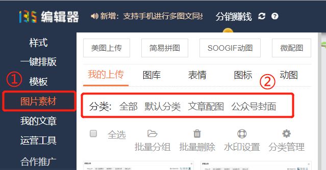 點(diǎn)開135編輯器左側(cè)的【圖片素材】,在上方就可以看到我們所創(chuàng)建的圖片分組。