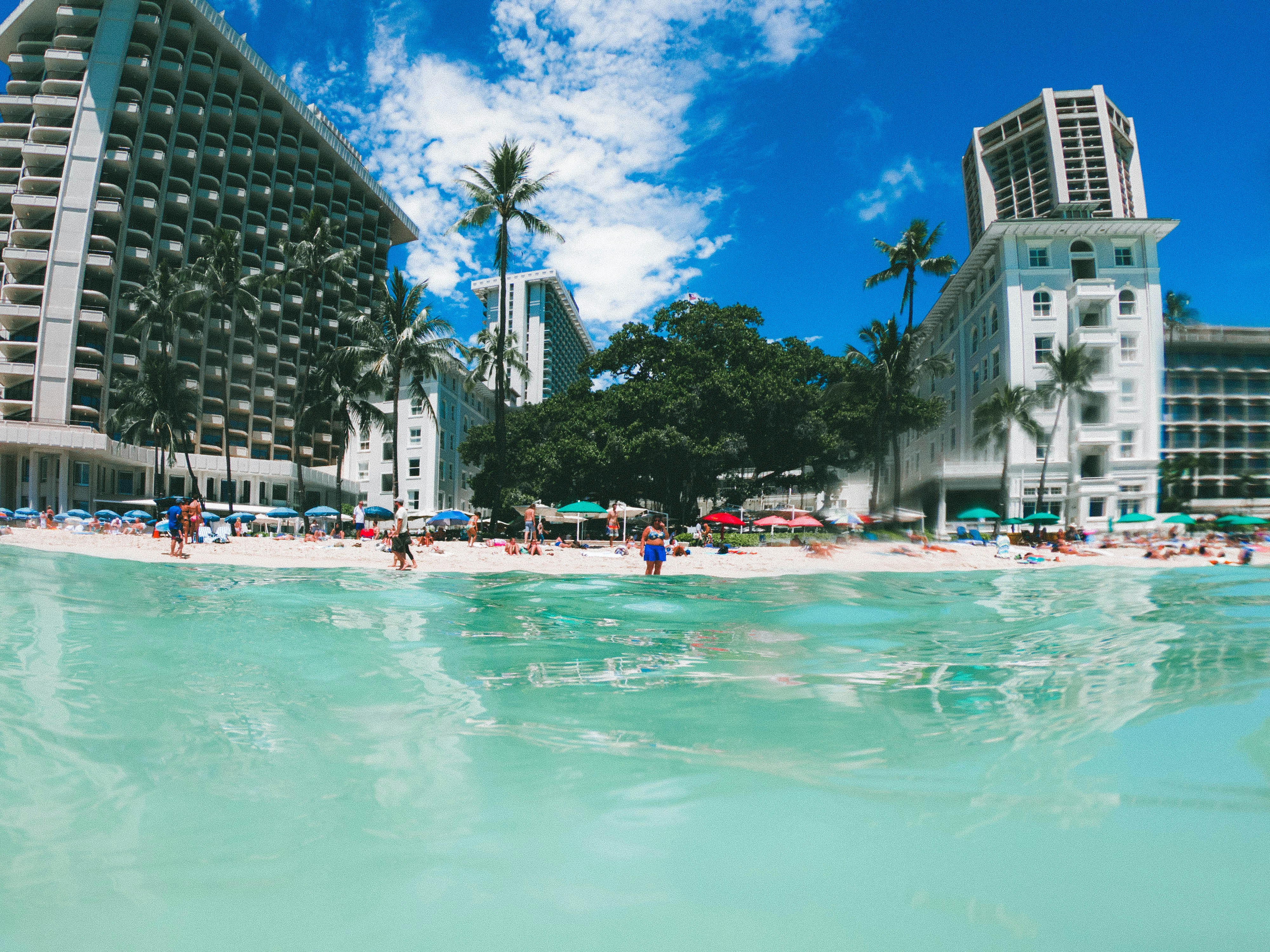 樹(shù)木、海灘、建筑物、沙灘、熱帶、夏天、旅游者、夏威夷、水、海洋、平靜、度假勝地、旅游、人、游泳、放松、假日、棕櫚、繁忙、生活方式