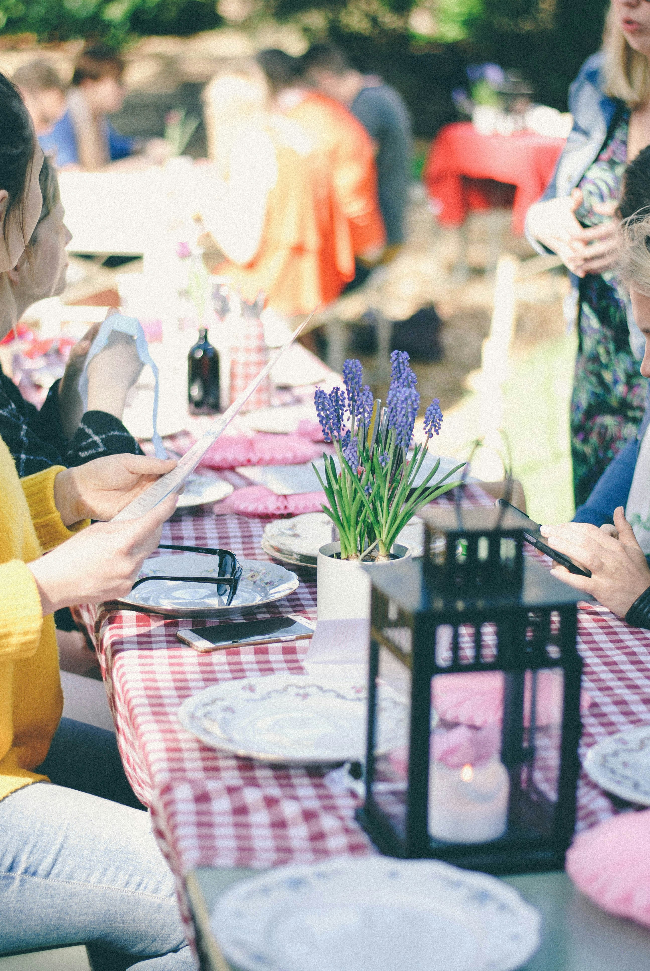 野餐,桌子,桌子,布景,花,花盆,餐具,戶外,晚餐,晚餐,人,人群,戶外晚餐,野餐桌,夏天,活動(dòng)